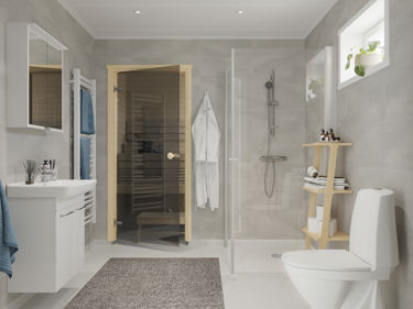 Till några av våra husmodeller finns möjlighet att byta ut förrådet i badrummet till en värmande och avkopplande bastu.