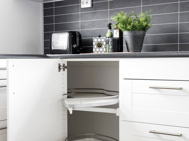Vill du utnyttja ditt hörnskåp i köket maximalt går det att välja till utdragbar inredning. Praktiskt och enklare tillgång till pannor och grytor.