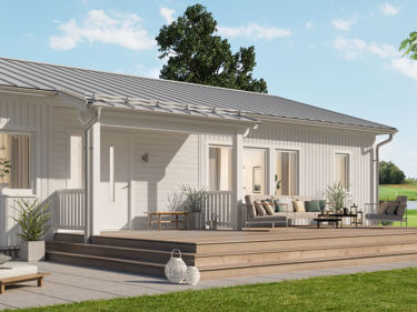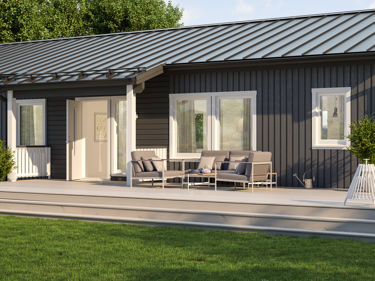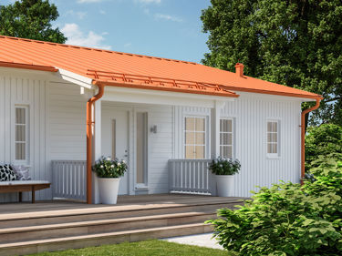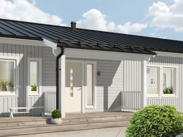 Till våra 1-planshus finns ett taktillval som omfattar ett modernt tak i 19° lutning i en tidlös bandtäckningsmönstrad plåt. Finns i svart, silver eller rött. Takkonstruktionen har ett lättare uttryck med mindre utsprång och nättare takfot. Här får du dessutom ett helt nytt integrerat skärmtak över entrén samt ett avvattningssystem och snörasskydd över entrén i takets färg.