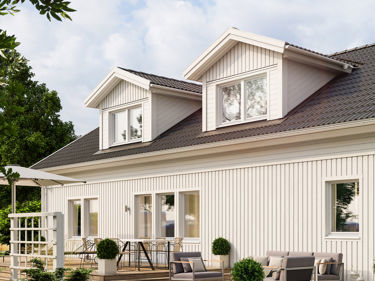 Ge ditt hus ett exteriört lyft och mer rymd och ljus till övervåningen genom att välja dubbla takkupor. Går att välja på baksidan av huset till våra husmodeller Edvard, Henrik, Åse, Astrid och Edith.