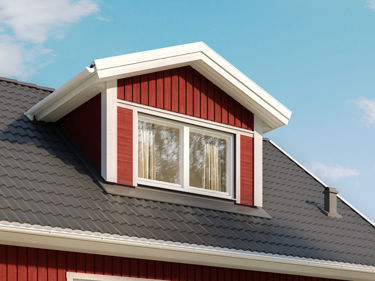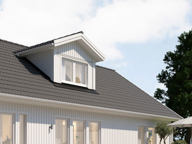 Takkupan är ett populärt tillval för våra 1,5-planshus och gör övervåningen både ljusare och rymligare. Går att välja antingen på fram- eller baksidan av huset.