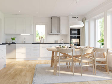 Villa Josefine, som vi valt som prisexempel, är ett flexibelt vinkelhus på 128 m² med fokus på generösa gemenskapsytor. Här finns två sovrum som standard med möjlighet upp till ytterliggare två sovrum för den större familjen. Två badrum. En väl tilltagen klädvård med egen ingång. Till Villa Josefine, liksom alla våra andra enplanshus, finns flera interiöra och exteriöra tillval.