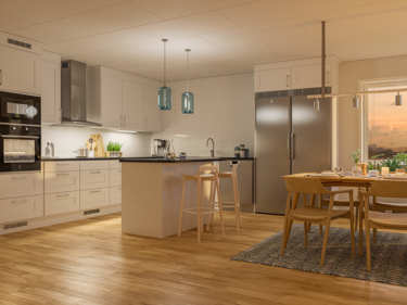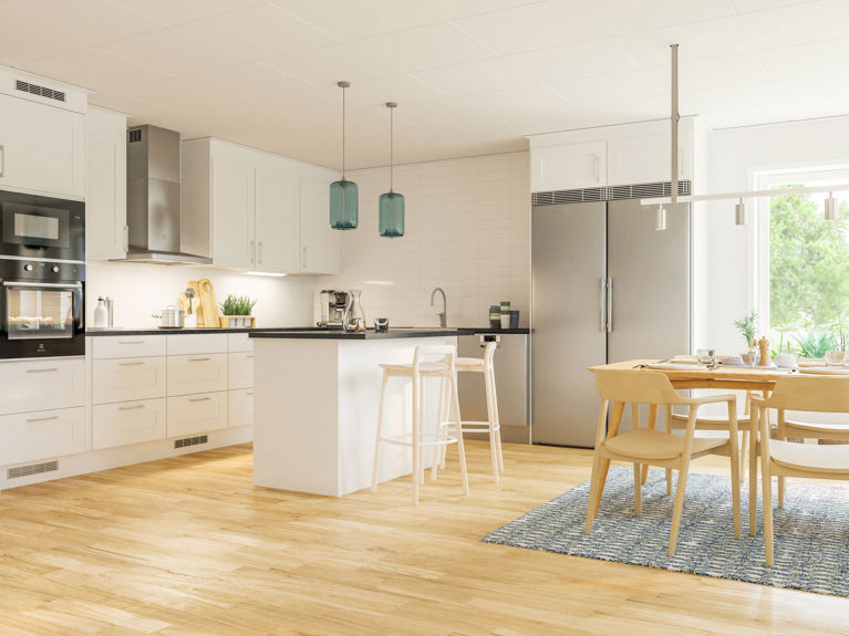 Den smarta planlösningen gör att ingen i familjen behöver känna sig trångbodd. Här finns också en praktisk tvättstuga i anslutning till hall och entré. Istället för att mötas av skor och jackor välkomnas både du och dina gäster av kökets aktiviteter.