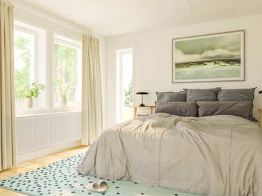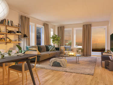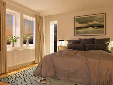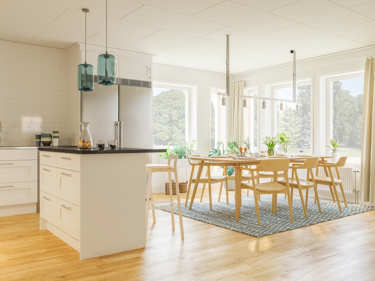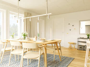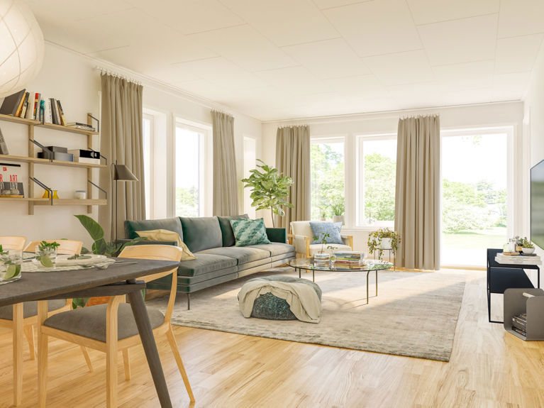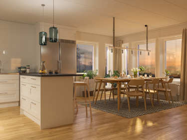 Längst in i huset hittar du det stora vardagsrummet som med tillvalet låga fönster får maximalt med ljusinsläpp. Här kan du i lugn och ro tillbringa kvällarna och ändå känna dig nära sovande barn.