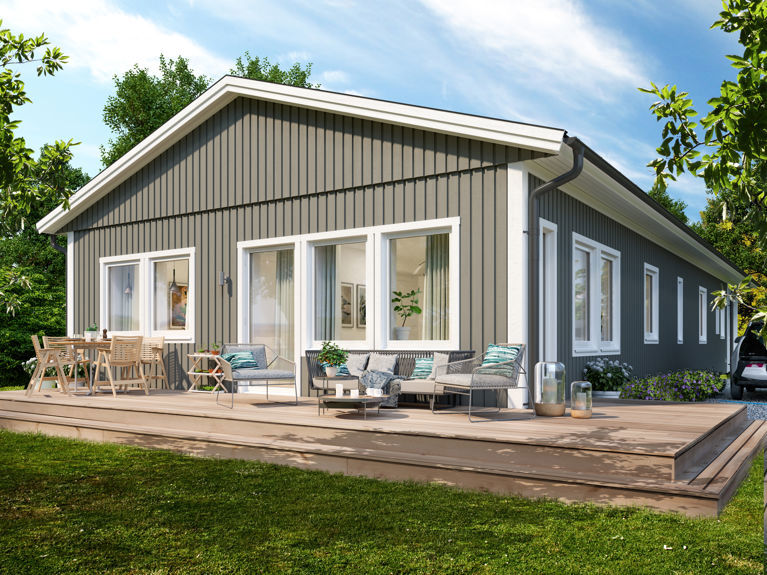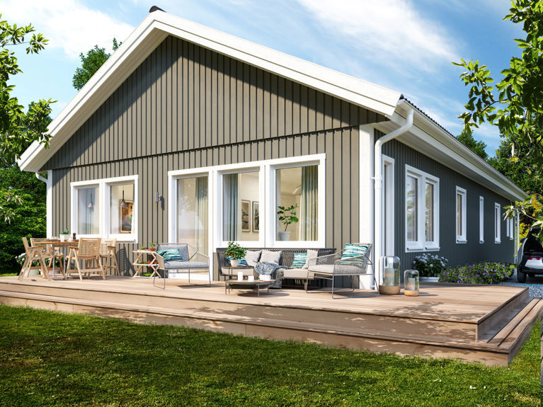 Till Alexander, liksom alla våra enplanshus, finns flera exteriöra tillval. Som vårt takpaket som består av ett tak i 19 graders lutning i en tidlös bandtäckningsmönstrad plåt.