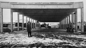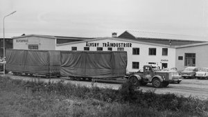 Det första Älvsbyhuset lämnar den nybyggda fabriken och kommer på plats på Trädgårdsgatan i Älvsbyn - där det står kvar än idag.