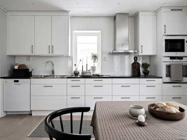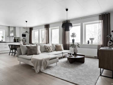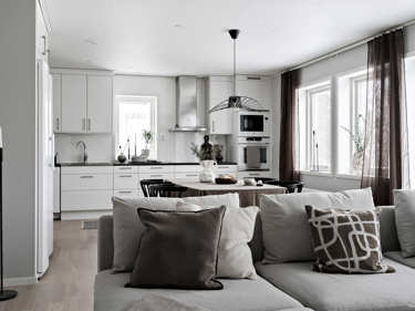 Det öppna och ljusa vardagsrummet är helt integrerat med köket och en självklar mötesplats. Här är ni lugnt sitta kvar vid matbordet när otåliga barn vill förflytta sig till tv-soffan.