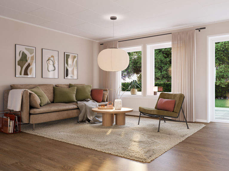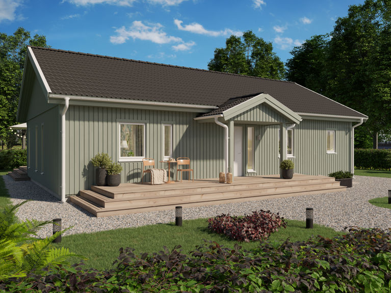 Eva är ett resultat av en rad efterfrågningar och önskemål från våra kunder. Det är också ett våra mindre enplanshus som kommer med tre rum som standard.
