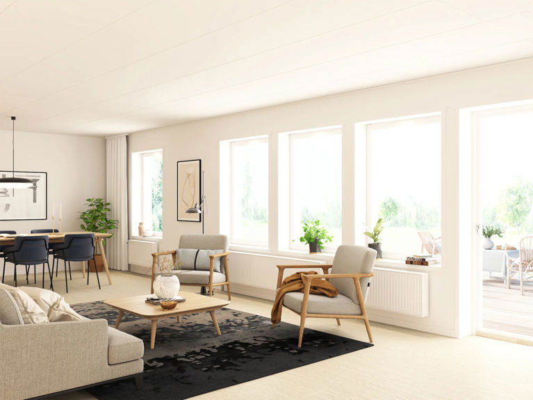 Drömmer du om att flytta ut middagarna på sommaren smälter vardagsrum och altan ihop extra fint med helglasad balkongdörr och låga fönster som tillval. Tänk sommarkalas med uppsikt över barnen från soffan.