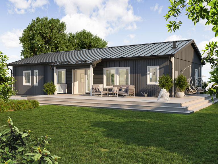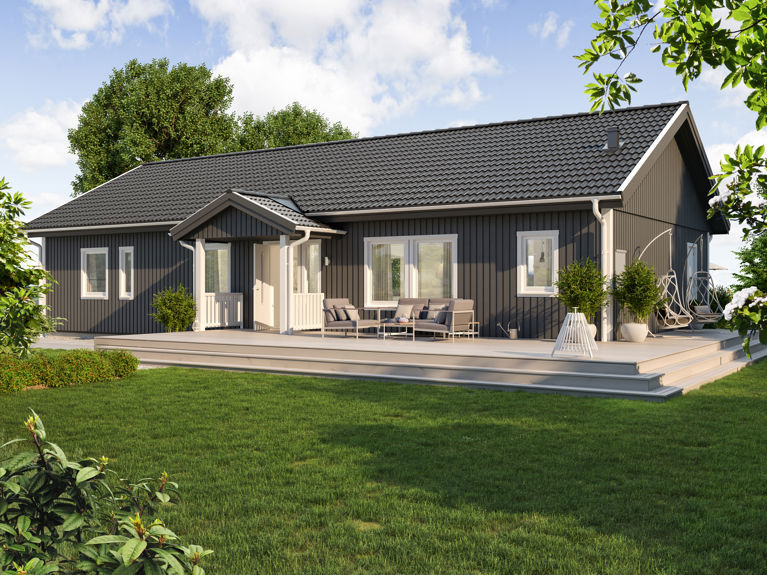 Till Linnéa, liksom alla våra enplanshus, finns flera exteriöra tillval. Som vårt takpaket som består av ett tak i 19 graders lutning i en tidlös bandtäckningsmönstrad plåt.