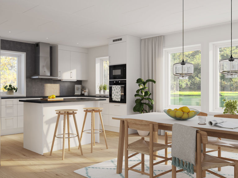 Linnéa stoltserar med det allra största integrerade köket/vardagsrummet av alla våra enplanshus. På 129 m² får du plats för både middagar och kalas.