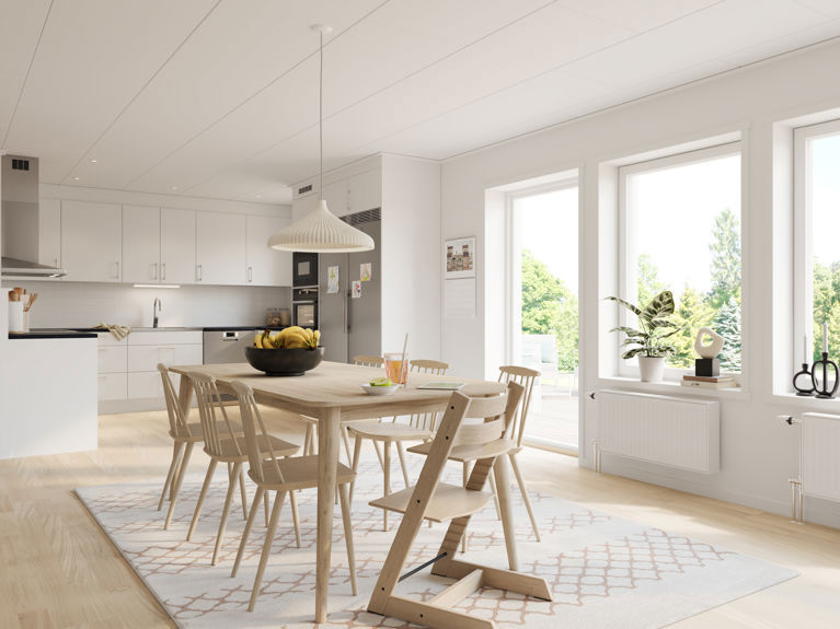 Det praktiskt u-formade köket ger dig ordentligt med arbetsytor. Den öppna och luftiga planlösningen mellan kök och vardagsrum gör också huset socialt och lätt att umgås i.