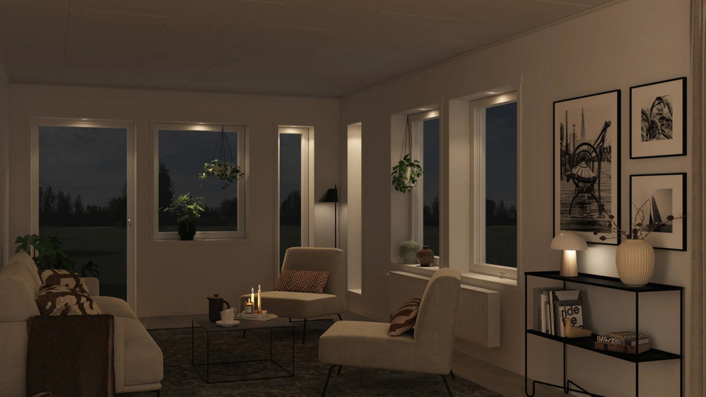 Åse är 1,5-planshuset för dig som har en fantastisk utsikt i ena riktningen. Det helt integrerade köket/vardagsrummet har här fått bre ut sig över husets ena hela långsida.