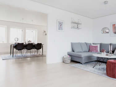 Två stora sovrum, ett rymligt badrum, en mindre toalett, tvättstuga, klädkammare och ett delvis integrerat kök/vardagsrum på över 60 m². Här kan du prata med gästerna även när du fixar det sista inför middagen.