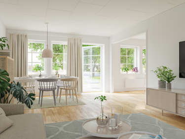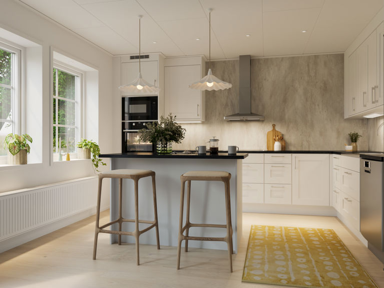 Det L-formade köket/vardagsrummet är placerat längst in i huset med fönster längs hela gaveln. Här kan du spendera många kvällar med utsikt över eventuell altan. Här finns också gott om plats för mysiga middagar med vänner.