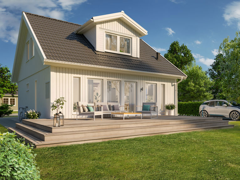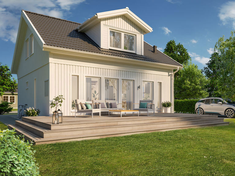 Alla våra 1,5-planshus går dessutom att få med tillvalet 34 graders taklutning med förhöjt väggliv. Det gör ytan på övervåningen rymligare. Även takkupa är ett populärt tillval och gör övervåningen både ljusare och luftigare. Med sin storlek och planlösning passar det lilla huset dessutom ypperligt som fritidshus.