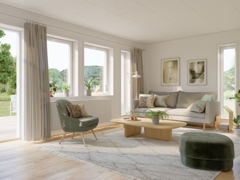 Lasse är vårt minsta 1,5-planshus med sina 63 + 33 m². Det passar både den mindre familjen och ensamhushåll eller par utan barn.