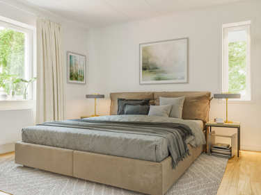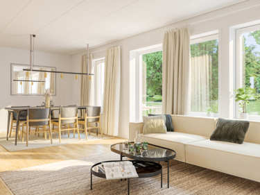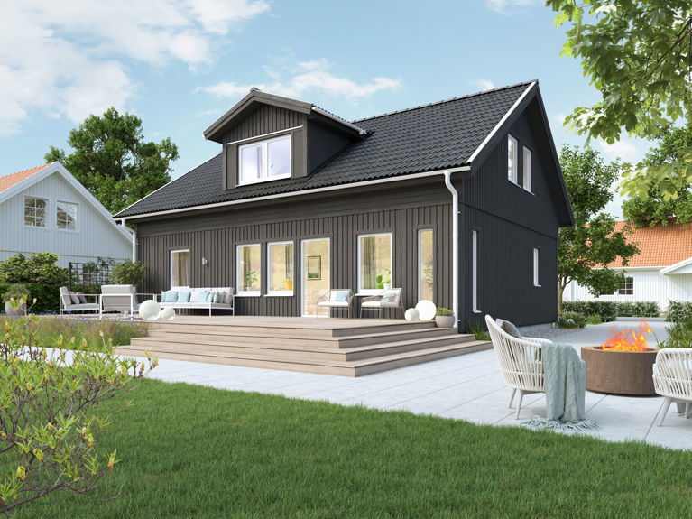 Med Selma får du ett litet, mysigt och gediget trähus på 85 m² nedervåning och 44 m² inredningsbar övervåning. Som växande familj är det här ett smart val.