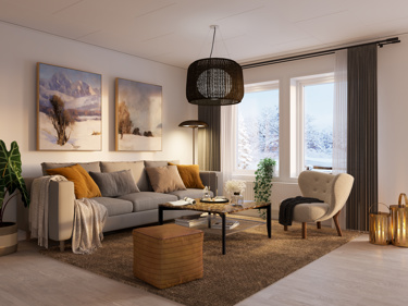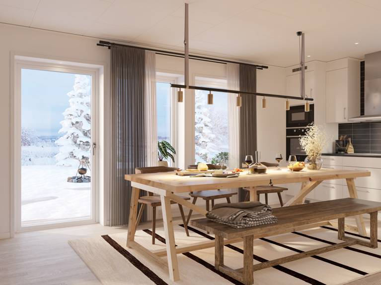 Det öppna och ljusa vardagsrummet är helt integrerat med köket och en självklar mötesplats. Här är ni lugnt sitta kvar vid matbordet när otåliga barn vill förflytta sig till tv-soffan.