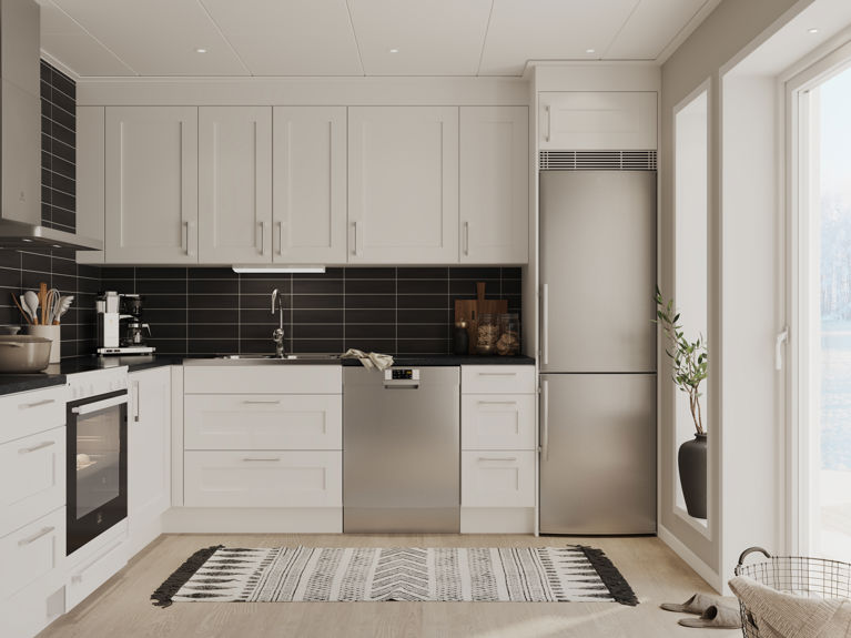 Det rymliga köket, med sitt trevliga ljusinsläpp från fönstren, får Siri att kännas större än sina kvadratmeter. Från köket har du även direkt kontakt med naturen och gårdsplanen utanför. Här är det enkelt att ta med sig morgonkaffet ut, tänk dig att starta dagen ute i morgonsolen eller krypa upp under en filt när den krispiga höstluften kommer. Med Siri får du alla möjligheter att skapa ett trivsamt fritidshus, på en plats där du kan varva ner och verkligen njuta av stunden.
