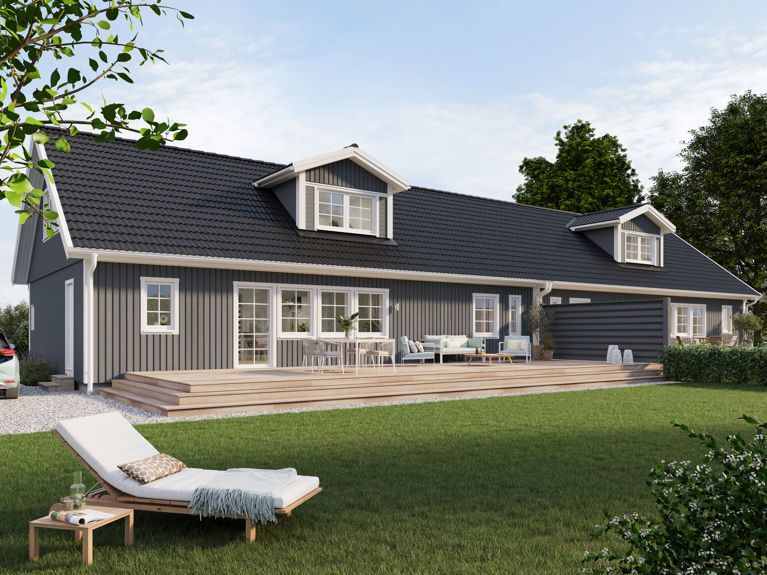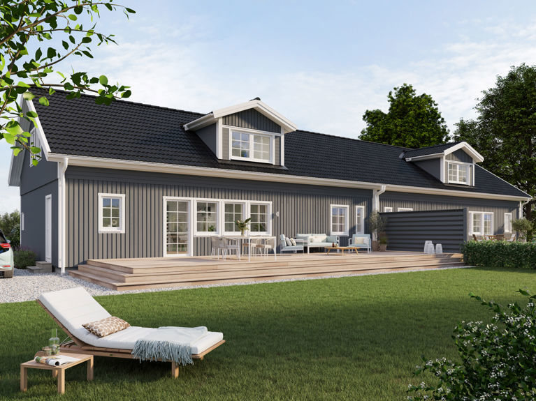Alla våra 1,5-planshus går dessutom att få med tillvalet 34 graders taklutning med förhöjt väggliv. Det gör ytan på övervåningen rymligare. Bygger du ett parhus måste båda husen förses med samma taklutning vilket kan vara bra att komma ihåg om du planerar ditt bygge tillsammans med någon. Även takkupa är ett populärt tillval och gör övervåningen både ljusare och luftigare.