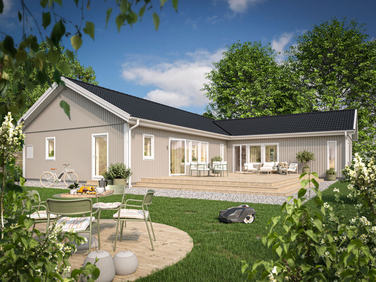 Regina är vårt allra största vinkel- och enplanhus. 172 m² och möjlighet till totalt fem sovrum. Drömmer du om en stor familj är det här huset för dig.