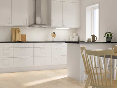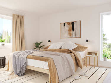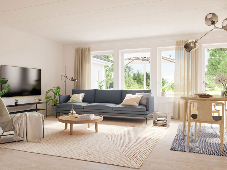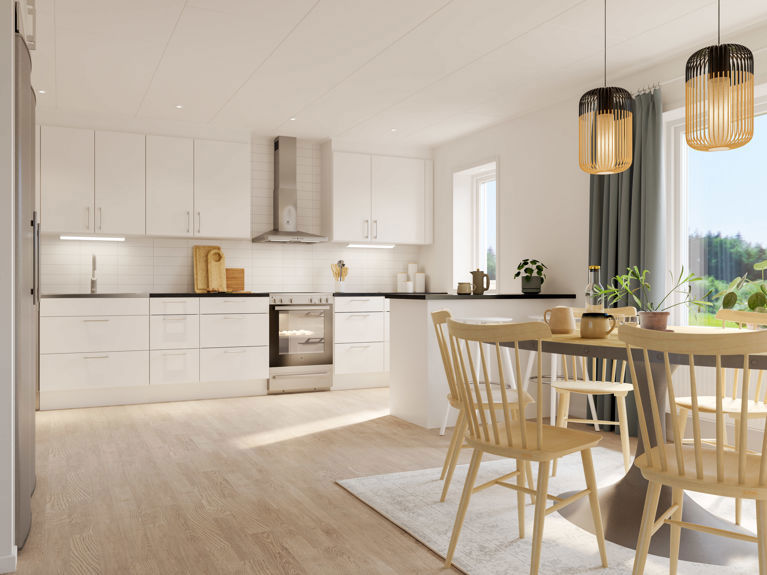 Trots antalet sovrum får kök och vardagsrum bre ut sig. 50 m² och gott om plats för både köksö, soffgrupp och loungemöbel. Lägg till två rejäla badrum, en rymlig tvättstuga, många förvaringsmöjligheter och en stor klädkammare i anslutning till ett av sovrummen. Som tillval kan du dessutom välja att sätta in en extra dörr från klädkammaren in till badrummet. Ser du drömhuset växa fram?