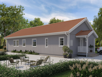 1,5-planshuset Edvard är en av våra största husmodeller med en omtyckt planlösning. Här finns gott om plats för både familjeliv och kompishäng. Med ett trevligt integrerat kök/vardagsrum på över 60 m² kan du prata med gästerna samtidigt som du fixar det sista inför middagen.