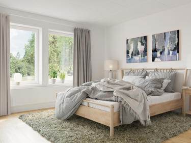 Josefine är det minsta av våra tre vinkelhus. Med sina 128 m² är det ändå så pass stort att det rymmer tre stora sovrum och två badrum som standard.